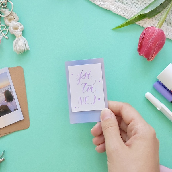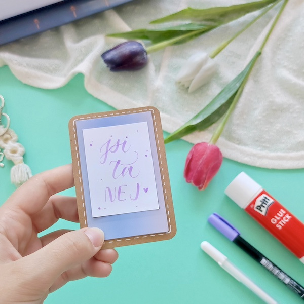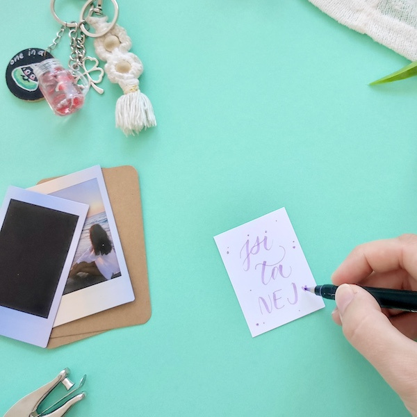 Na bílý obdélníček napíšeme vzkaz, který chceme sdělit. Klíčenku můžeme darovat komukoliv – kamarádce, mamince nebo dalším členům rodiny, příteli, paní učitelce ad. Já si vybrala zhotovit klíčenku pro kamarádku a napsala „Jsi ta nej“. Zvolila jsem fialový odstín brushpenu, který ladí se snímky Macaron.