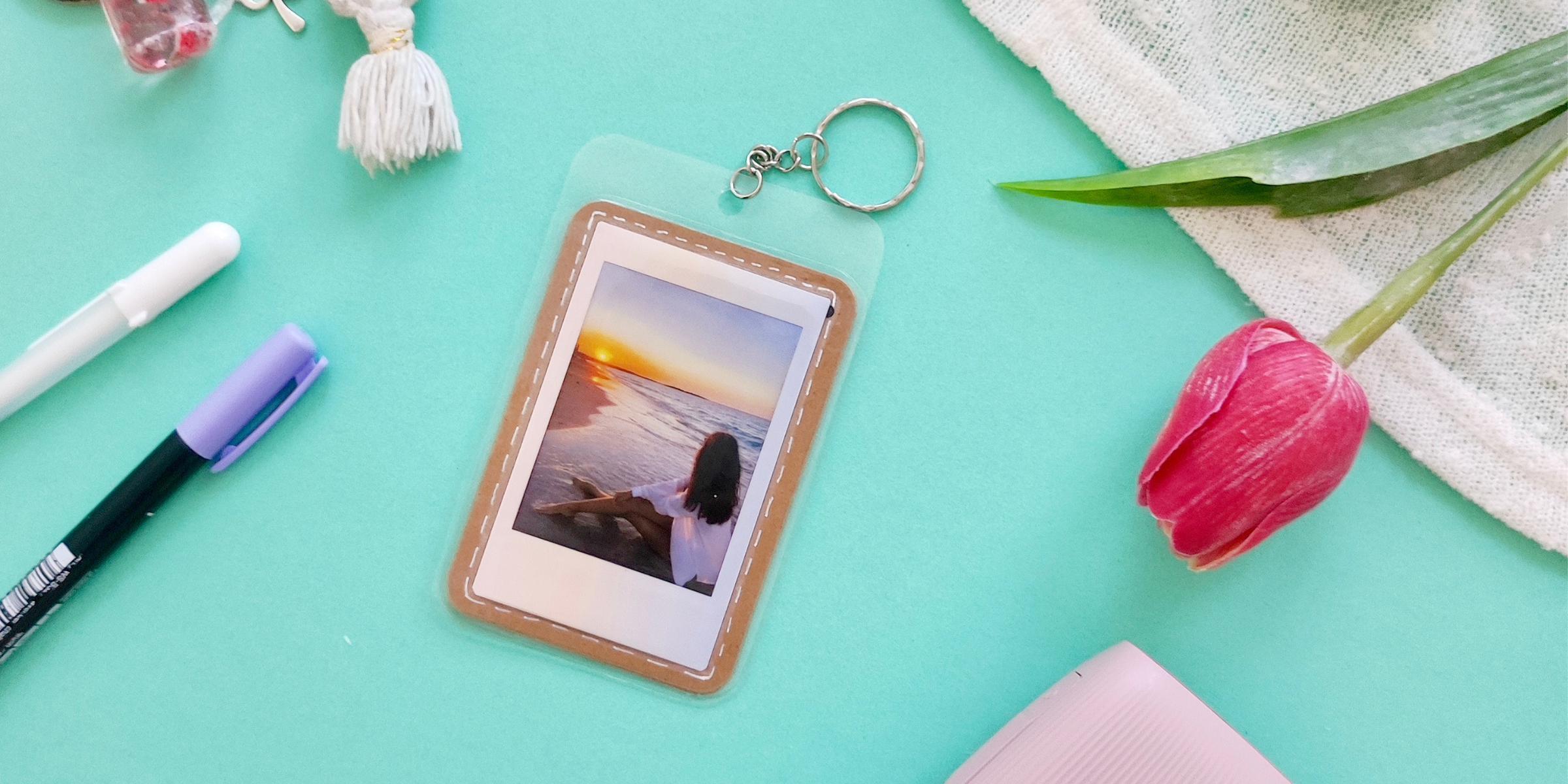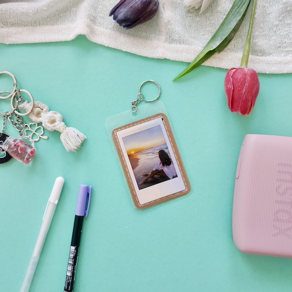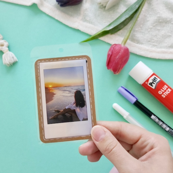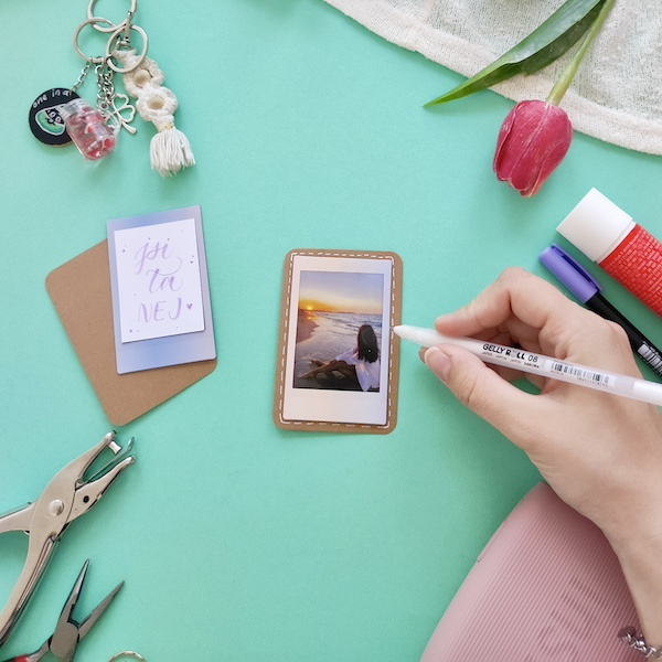 Jakmile máme nadepsaný bílý obdélníček, nalepíme jej na nepovedený snímek Instax. Pomocí tiskárny si vytiskneme vzpomínku, kterou chceme na klíčence zachovat. Snímky nalepíme na kraftový papír z obou stran. Pomocí bílé gelovky nakreslíme kolem snímků čárkovaný rámeček.