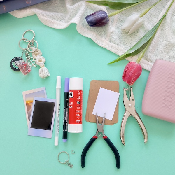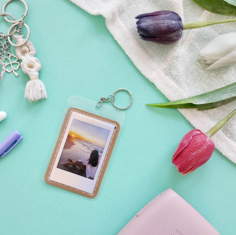 Po zalaminování opatrně vystřihneme jednotlivé snímky, ideálně s menším laminovacím okrajem kolem celého obrázku. Tento okraj slouží jako ochranná vrstva, díky němu se klíčenka nerozlepí a fotografie zůstane chráněná. V horní části si ale záměrně necháme o něco větší kousek folie. Právě sem totiž uděláme malou dírku, do které už stačí jen připevnit kroužek na klíče.