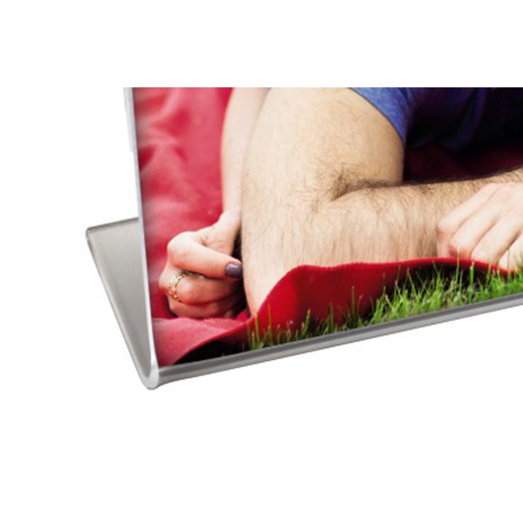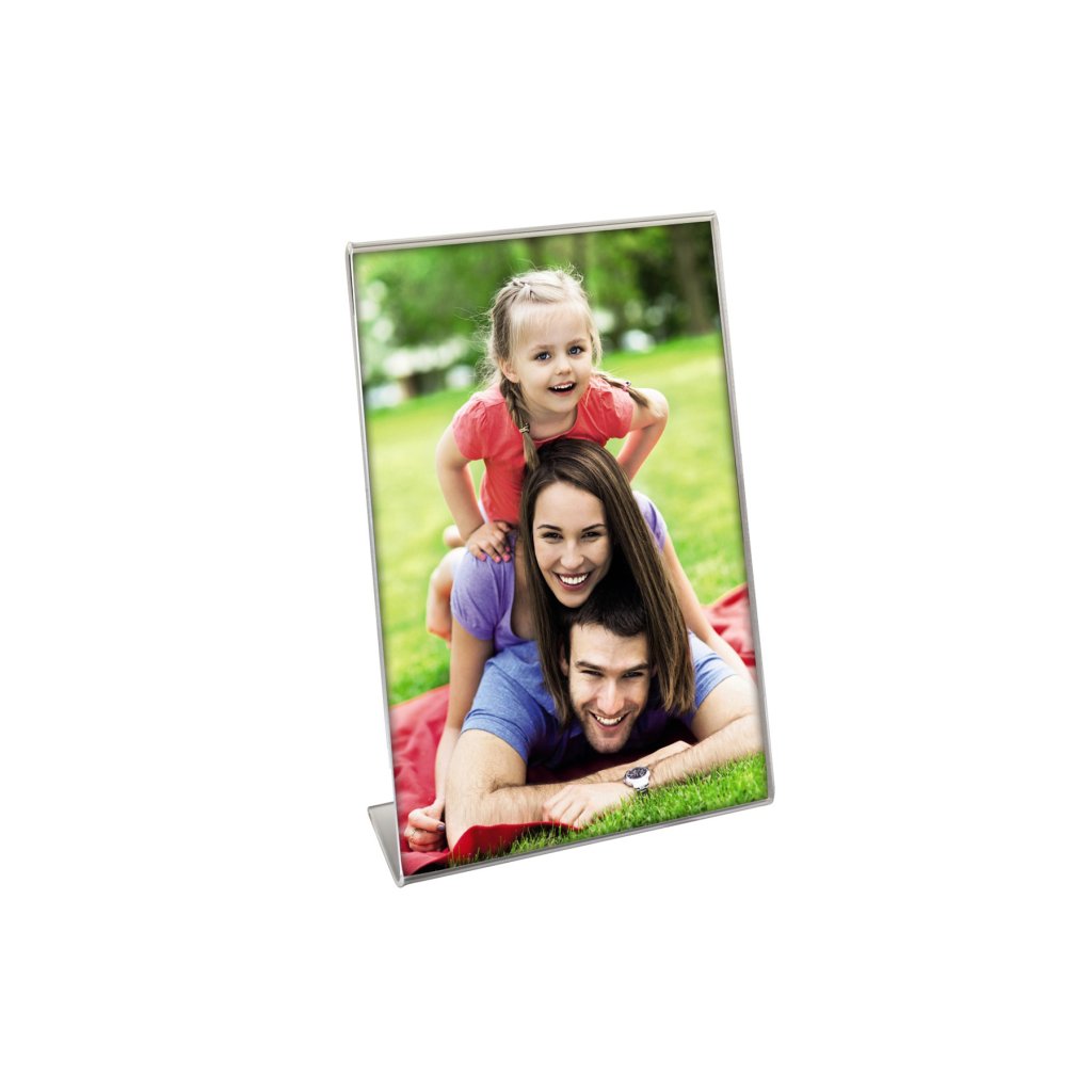 Originální fotorámeček na fotografii pro váš snímek z fotoaparátu. Velmi elegantní a praktické provedené. Materiál akrylátová průhledná deska. Samostatně stojící díky svému tvaru do písmene L.