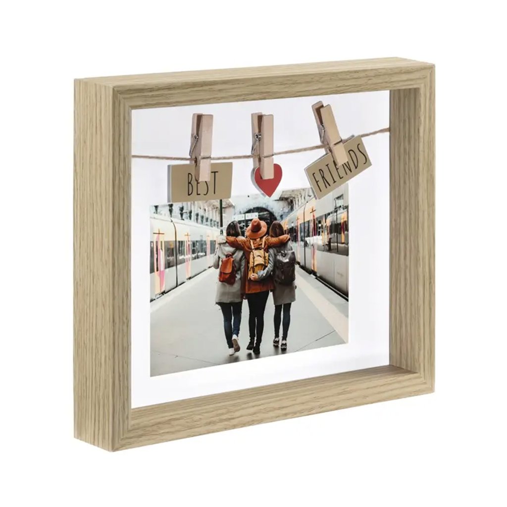 Designový foto rámeček ze dřeva pro snímky velikosti 10 x 15 cm. Kvalitní vysekávaná pasparta se šikmým bílým řezem. Obsahuje 3 malé dřevěné kolíčky a kartičky s nápisem BEST a FRIENDS a symbolem srdce.