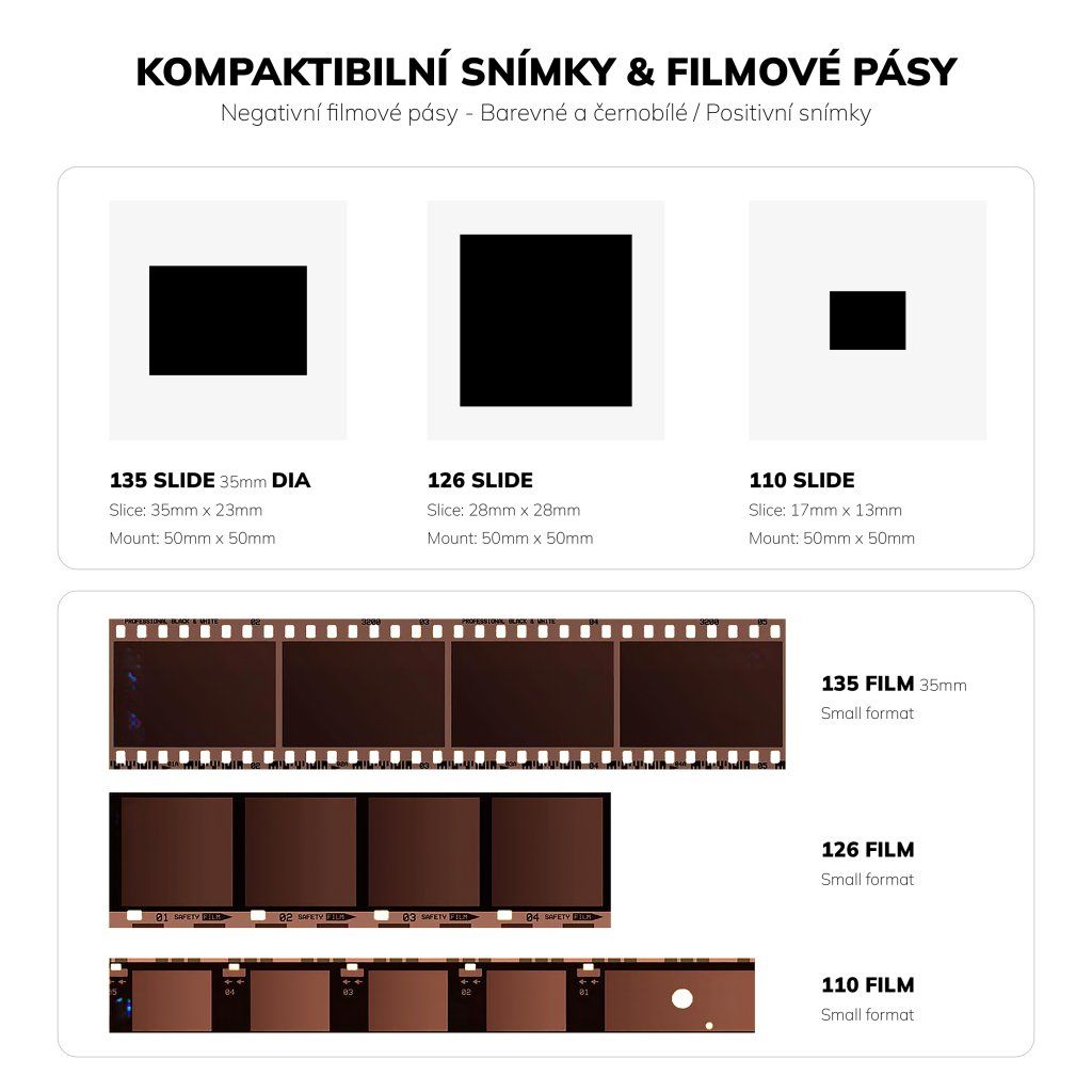 - Podporované typy filmů: 50 mm diapozitivy (135, 110, 126)